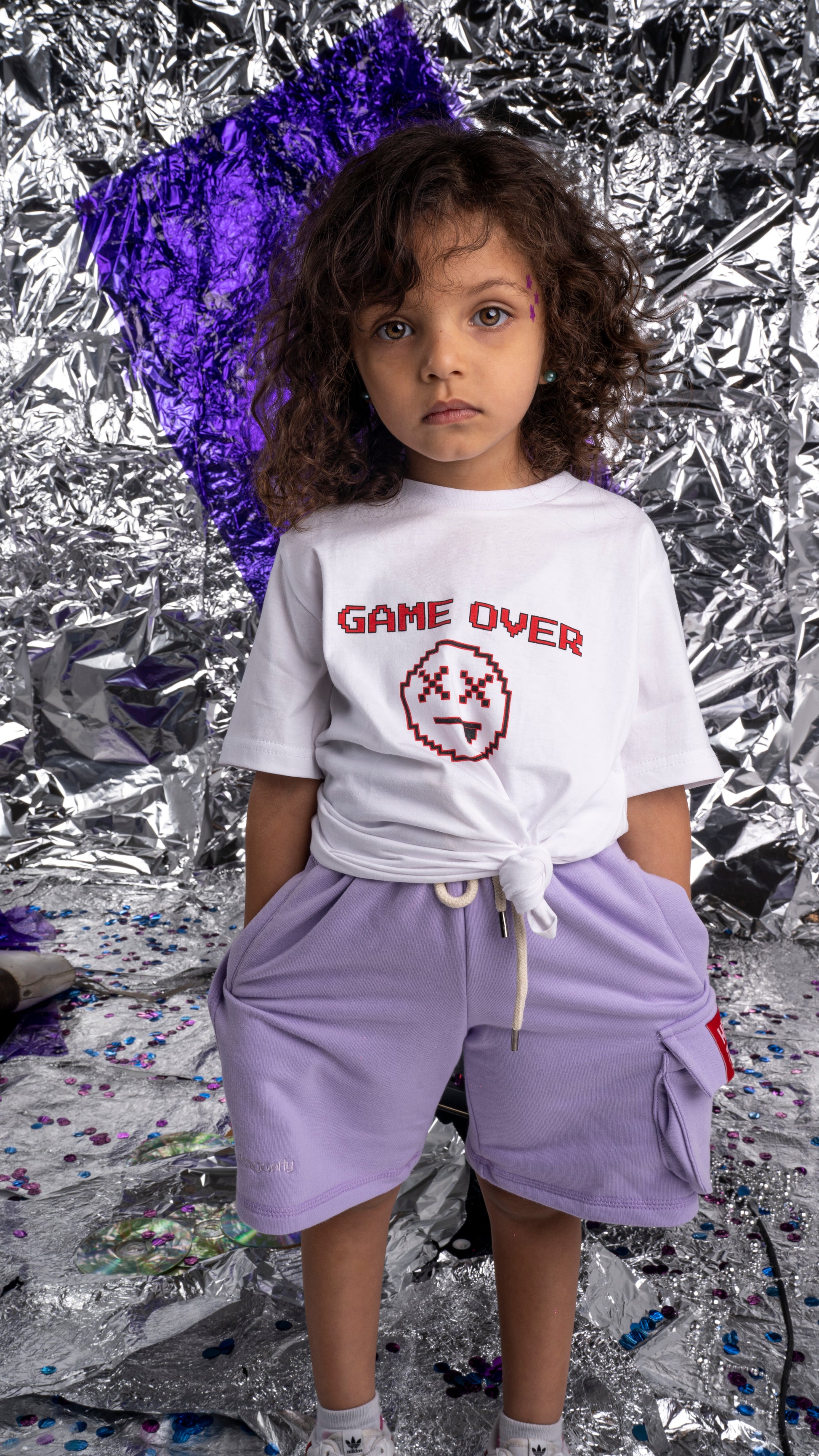 100% Cotton lilac shorts tagged with a red and white patch saying “hello there!”.